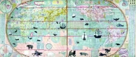 这幅地图是意大利传教士利玛窦献给大明万历皇帝的礼物,备受万历皇帝喜爱。在地图上,利玛窦绘制了世界各地的风土人情,在各大洋中,绘有不同类型的帆船9艘,在各个海域中还绘有鲸、鲨、海狮等海生动物15头,南极大陆上还绘有陆上动物大象、狮子、鸵鸟等8头。地图上还以注释的形式,介绍了世界各地的风土人情。比如,介绍了南美洲国家伯西尔(即巴西):“伯西尔,此言苏木。此国人不作房屋,开地为穴以居,好食人肉,但食男不食女,以鸟毛织衣。”