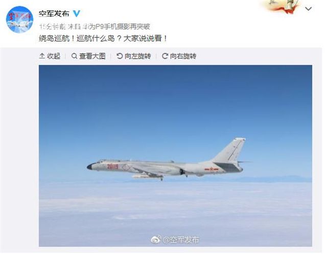 申进科还提到,轰-6K等战机成体系飞越宫古海峡、巴士海峡,实施了“绕岛巡航”等训练课题。随后空军还在官方微博上发了一张轰-6K训练图,并配文“绕岛巡航 ! 巡航什么岛 ? 大家说说看 !”