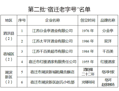 历经风雨沧桑的老字号是宿迁发展的见证,也是宿迁的宝贵历史财富。在第二批申报中,经企业申报、县区推荐、实地查验、专家评审、公示复议复审等五个环节,认定“宿迁市红楼酒家有限责任公司”等6家企业(品牌)为第二批“宿迁老字号”。同时,对“江苏天之香食品有限公司”等6家第一批“宿迁老字号”进行复审认定;此外,“江苏洋河酒厂股份有限公司”等3家“中华老字号”企业依申请自动转为“宿迁老字号”。