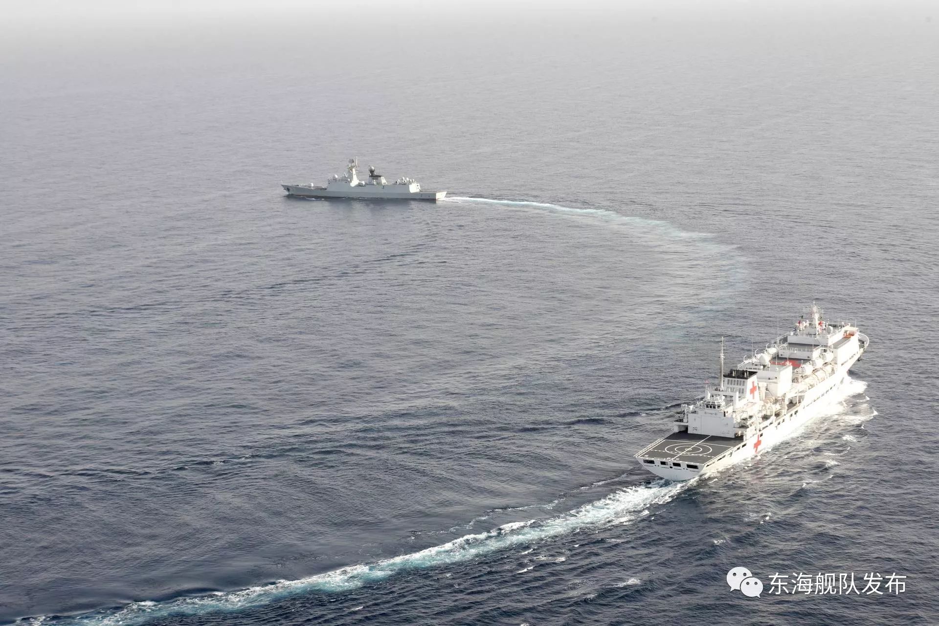 ▲8月16日7时30分许,和平方舟医院船与正在执行第26批护航任务的扬州舰在亚丁湾东部海域会合后组织编队运动