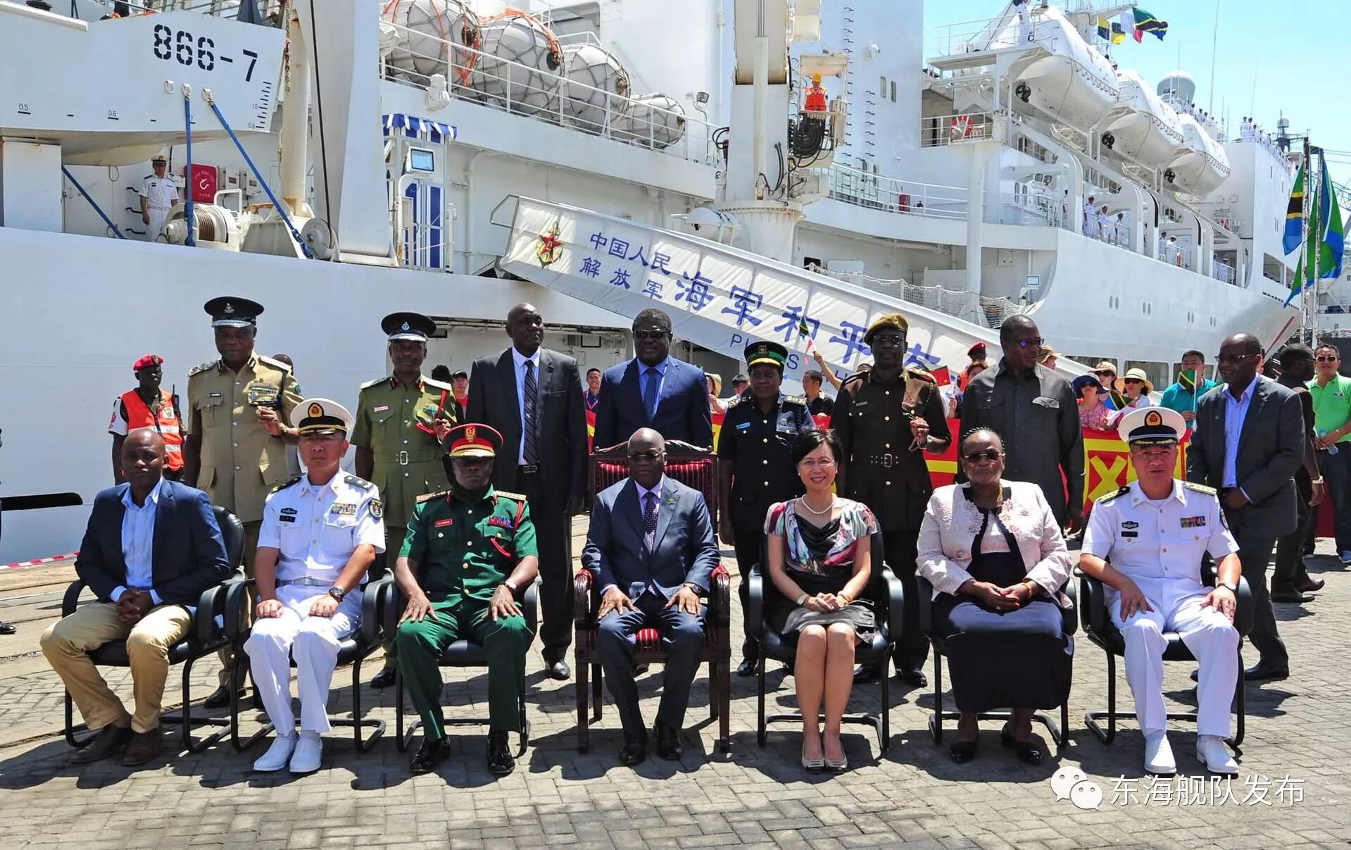 ▲11月26日,在达累斯萨拉姆港码头,坦桑尼亚总统马古富力在欢送仪式上,与“和谐使命-2017“任务指挥员领导、中国驻坦大使王克及坦军政官员以和平方舟医院船为背景合影留念