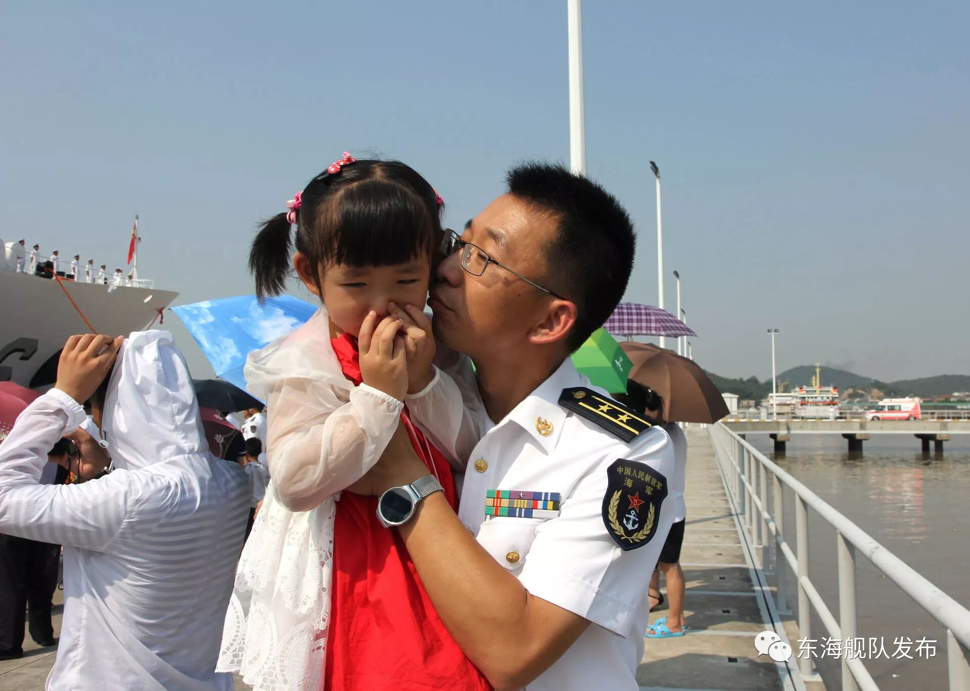 ▲7月26日上午,浙江舟山某军港,和平方舟医院船执行“和谐使命—2017”任务欢送仪式现场,一名任务军官亲吻女儿