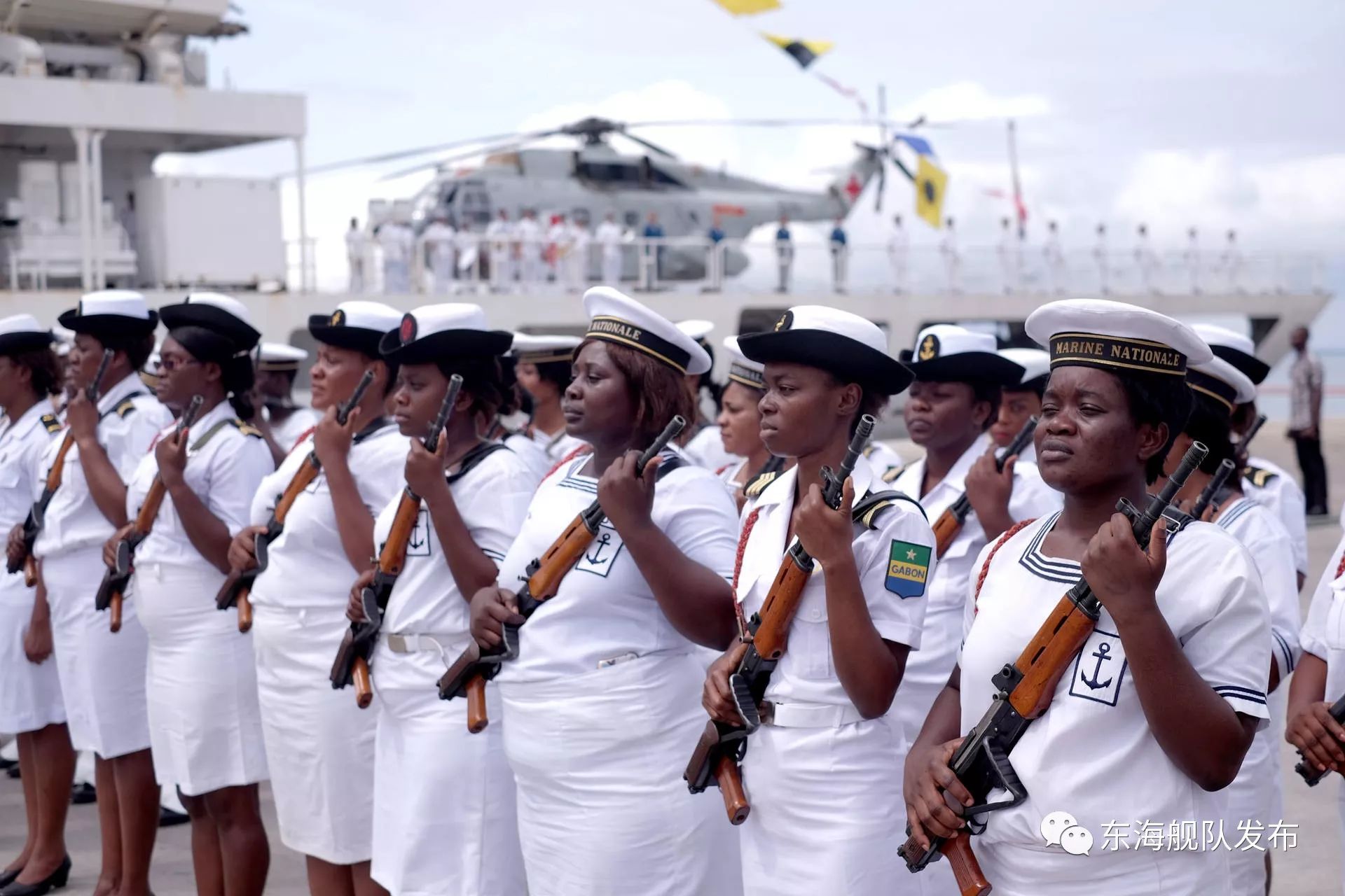 ▲10月1日,加蓬利伯维尔奥文多港码头,加仪仗队列队欢迎和平方舟医院船首次到访