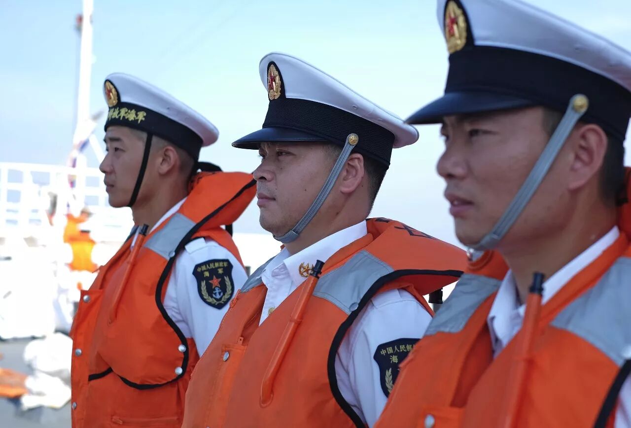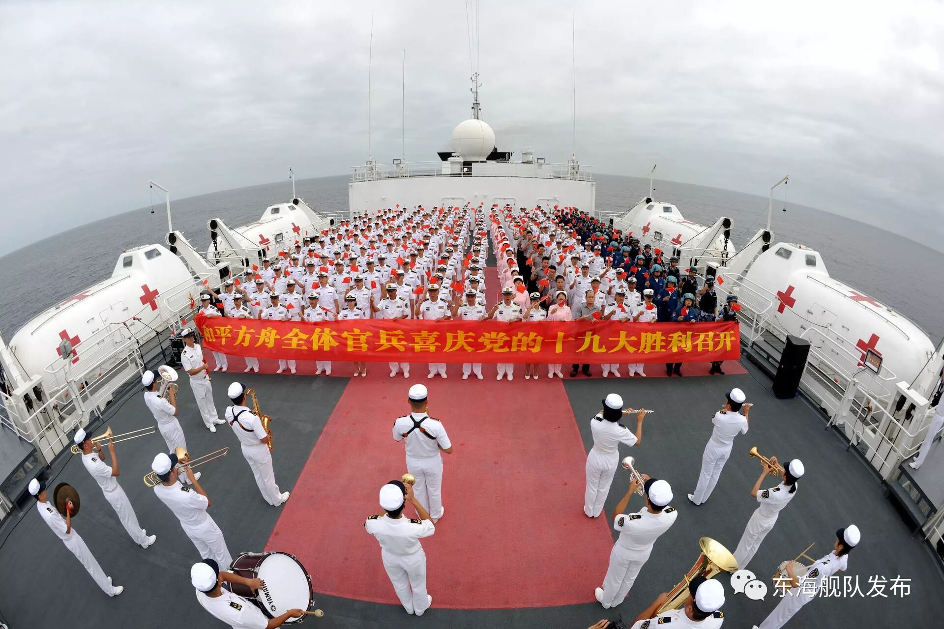 ▲10月18日,南大西洋上,执行“和谐使命-2017”任务的和平方舟医院船任务官兵挥动国旗齐唱《人民海军向前进》,喜庆党的十九大胜利召开