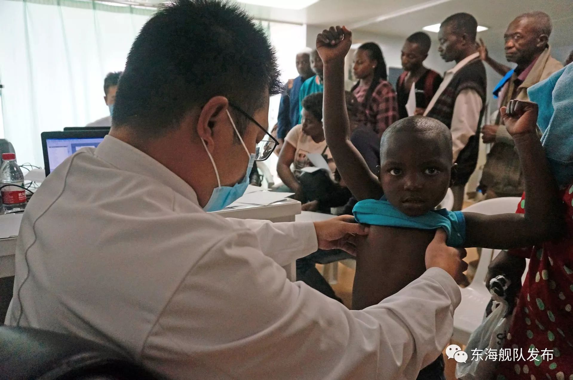 ▲11月9日,和平方舟医院船主平台,外科医生正为莫桑比克3岁患儿进行胸部检查