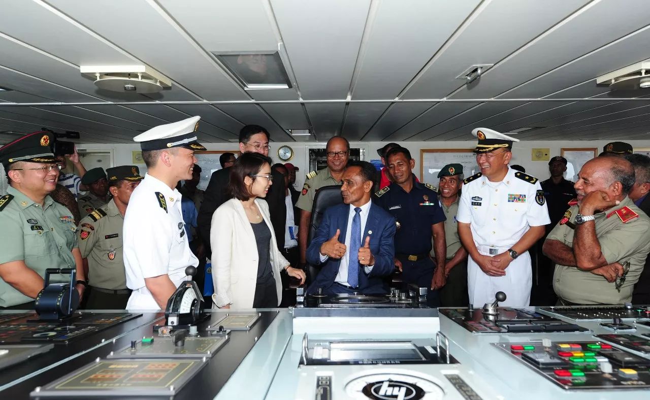 ▲在和平方舟医院船驾驶室,东帝汶防务安全部长索莫丘举起两个大拇指称赞和平方舟医院船漂亮、先进