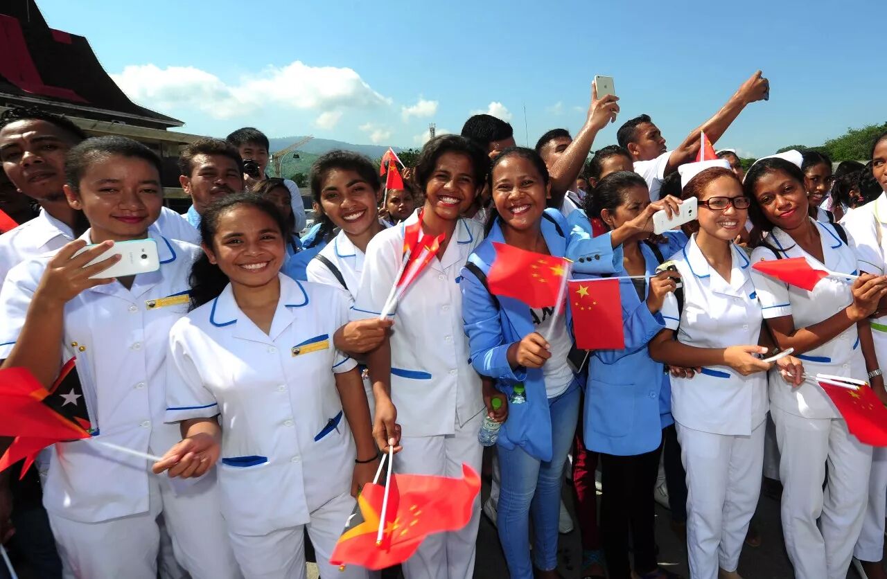 ▲东帝汶民众和学生挥动中国与东帝汶两国国旗欢迎和平方舟医院船首次到访
