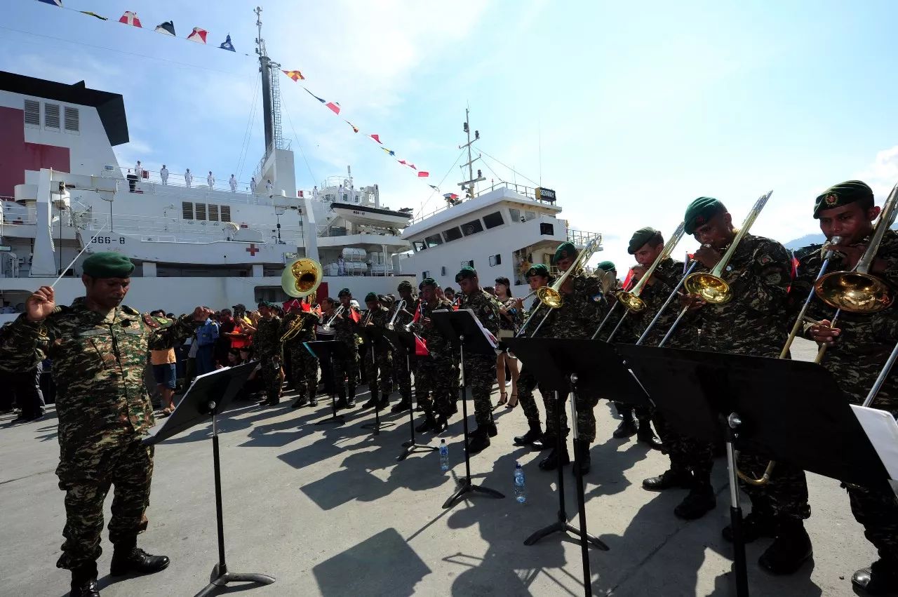▲东帝汶军乐队演奏迎宾曲欢迎和平方舟医院船首次到访