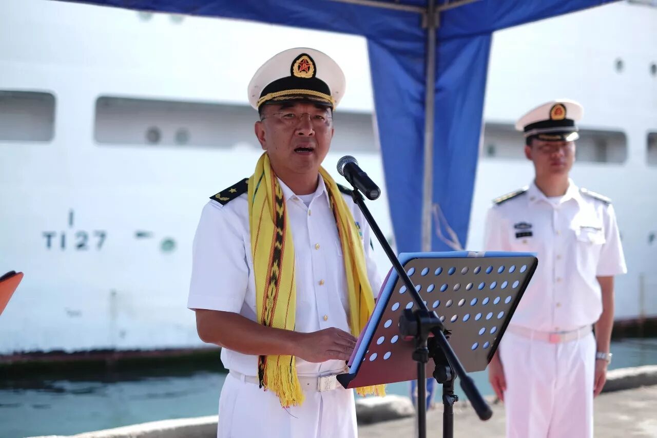▲“和谐使命-2017”任务指挥员管柏林在欢迎和平方舟医院船访问东帝汶仪式上致辞