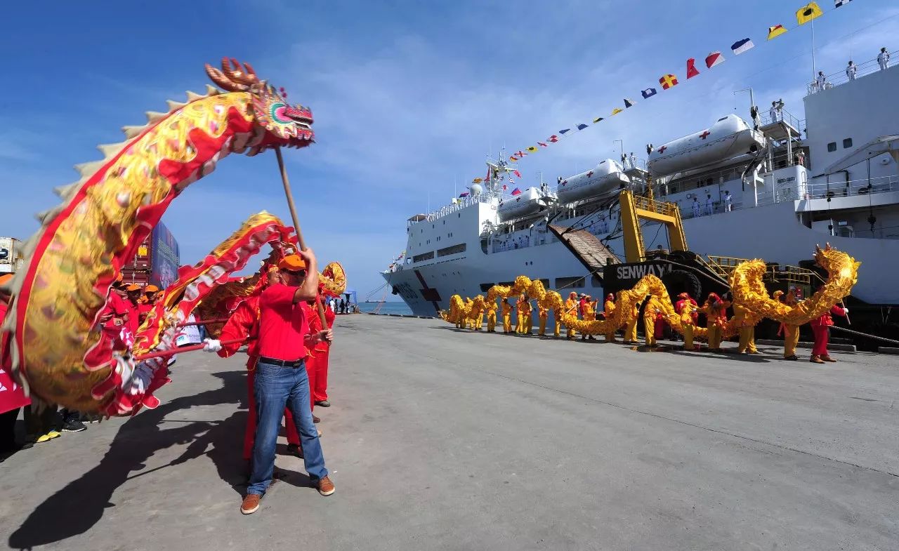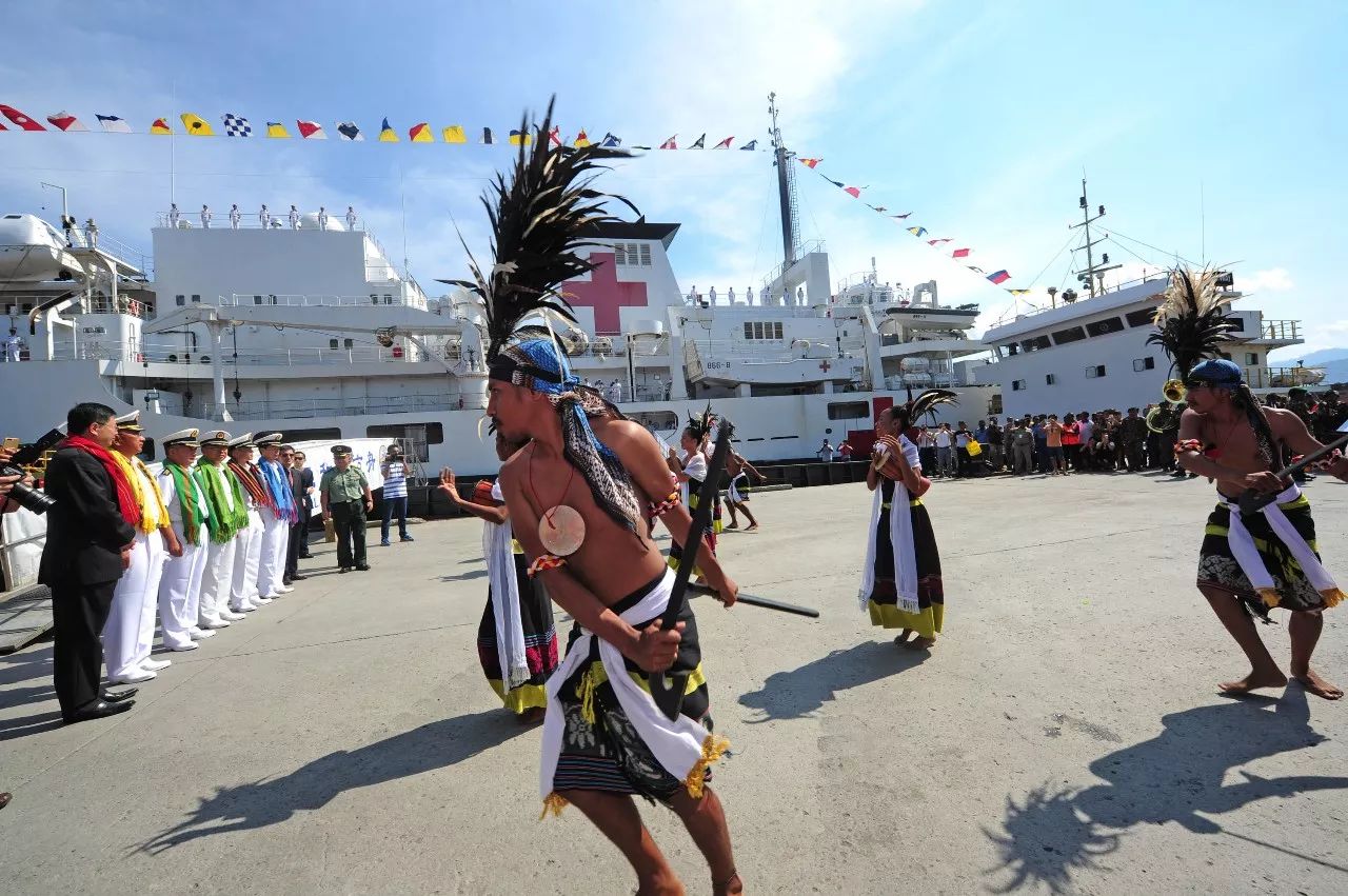 10时许,和平方舟医院船在东帝汶海军舰艇引导下,缓缓驶抵帝力港。东帝汶政府在码头举行了盛大的欢迎仪式,当地民众身穿民族服饰,载歌载舞,热情欢迎和平方舟首次到访。东帝汶防务安全部长索莫丘,中国驻东帝汶大使刘洪洋、武官黄大民及中国驻东帝汶使馆工作人员、中资机构、华侨华人代表等500余人到码头迎接。