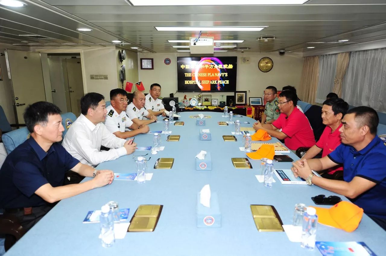 ▲在和平方舟医院船会议室,“和谐使命-2017”任务指挥所领导、中国驻东帝汶大使刘洪洋等亲切接见中资企业、华人华侨代表