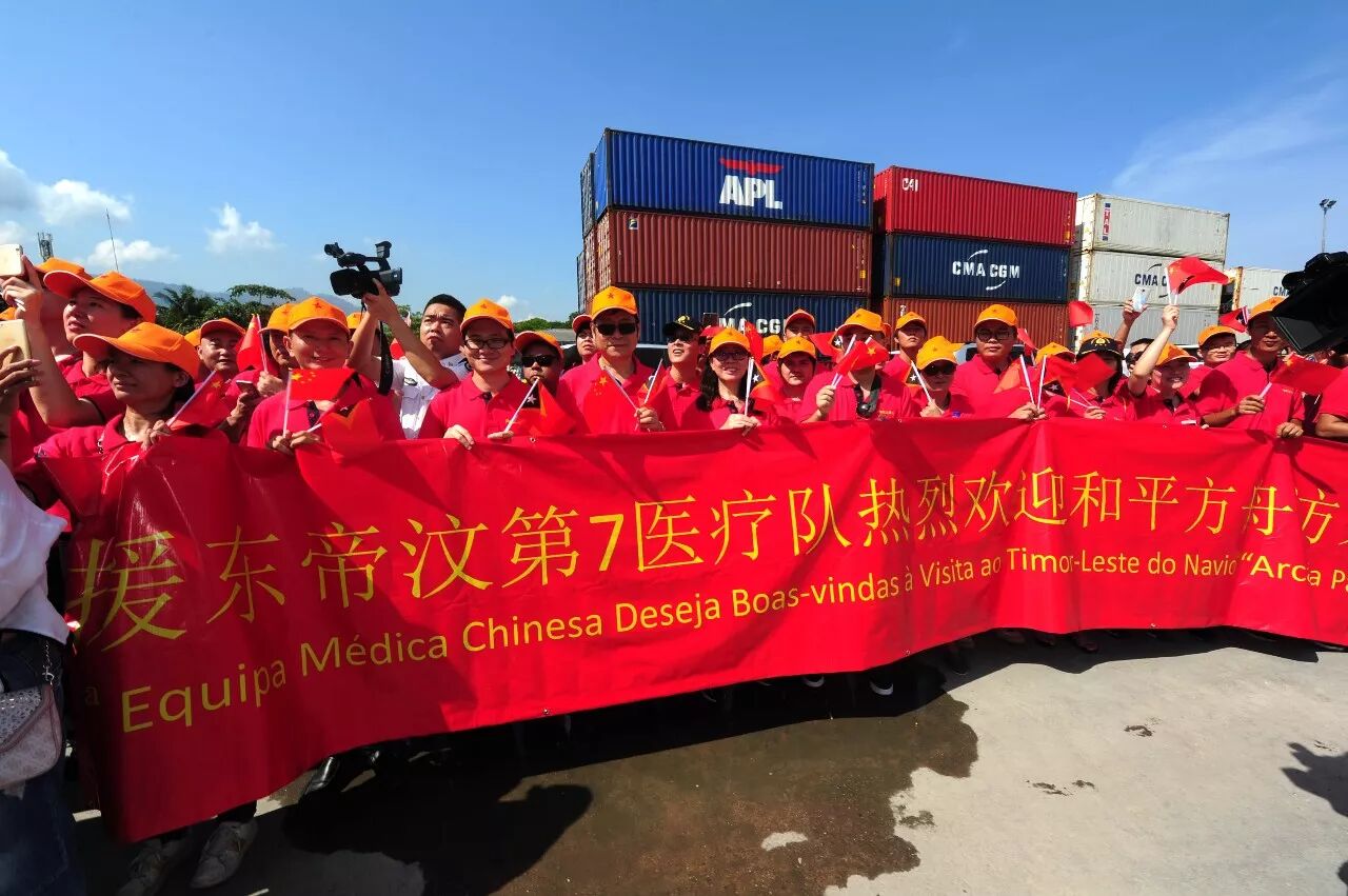 ▲中资机构员工、华人华侨挥动中国与东帝汶两国国旗欢迎和平方舟医院船首次到访
