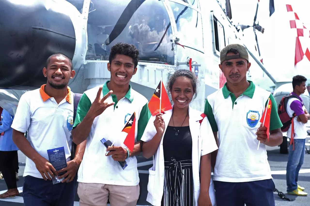 ▲在和平方舟医院船飞行甲板,东帝汶青年学生饶有兴趣参观救护直升机