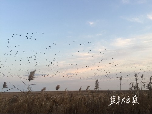 △图为大批候鸟在保护区上空飞舞,场面壮观