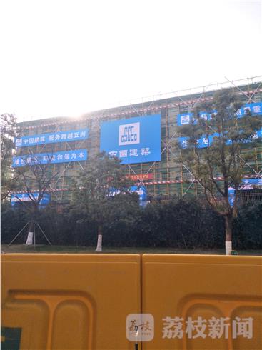 12月18日,记者来到了宁夏路13号小区。小区的一号楼外侧已经安装上了脚手架,不少工人正在抓紧施工。记者发现,在大楼外部的脚手架上挂上了一个近30平方的大型广告牌,上面写着“中国建筑”,还有四条大型标语。