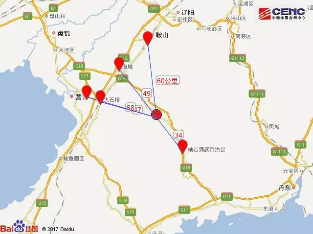 震中距岫岩满族自治县34公里、距大石桥市47公里、距海城市49公里、距老边区58公里、距千山区60公里,距鞍山市64公里,距沈阳市149公里。