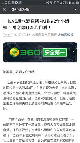 老周坐不住了,他的反应还是很快的。也许是等不及新闻发布会的召开,12日,公众号“360黑板报”出了一文《一位95后水滴直播PM致92年小姐姐:谢谢你盯着我们看!》