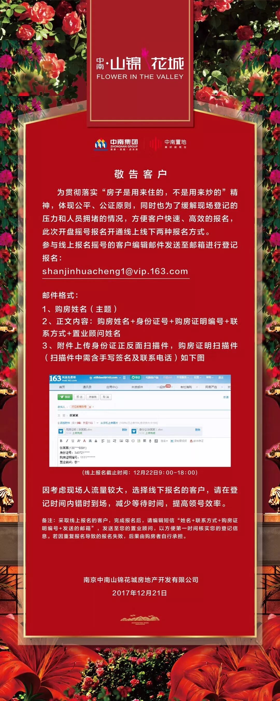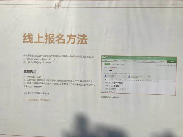 该项目于今天上午9:00到18:00在售楼处登记,带身份证原件复印件、购房证明原件复印件、征信报告原件复印件。登记方式有线上线下两种,参与报名登记的客户可编辑邮件发送至以下任意一个邮箱进行线上报名登记: