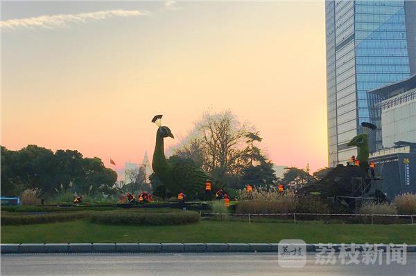 清晨,太阳还未升起,园林绿化工人们早已忙碌起来,10多米高的孔雀绿雕旁搭起三层楼高的脚手架,穿着橘红色的背心工人们,爬上孔雀后背,换着绿植。