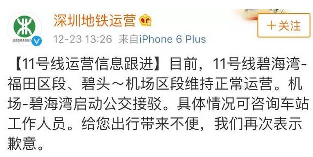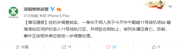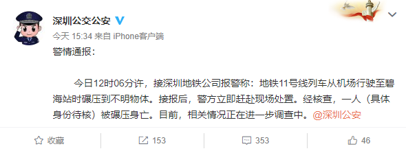 据@深圳公交公安 通报:今日12时06分许,接深圳地铁公司报警称:地铁11号线列车从机场行驶至碧海站时碾压到不明物体。接报后,警方立即赶赴现场处置。经核查,一人(具体身份待核)被碾压身亡。目前,相关情况正在进一步调查中。
