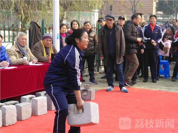 女子综合赛首先登场,来自秣陵街道的李之玉、张金华,拎起80斤的石锁表演推轮,往上一抛,转动石锁,又接到手中。她们二人分别获得冠军和亚军。