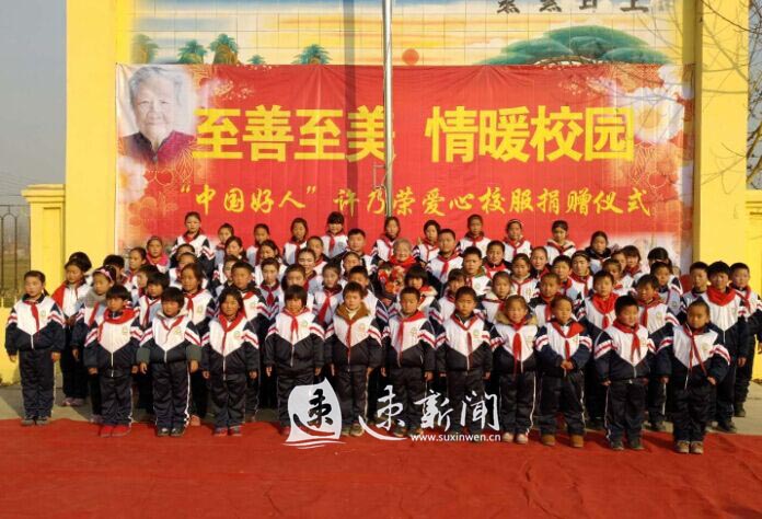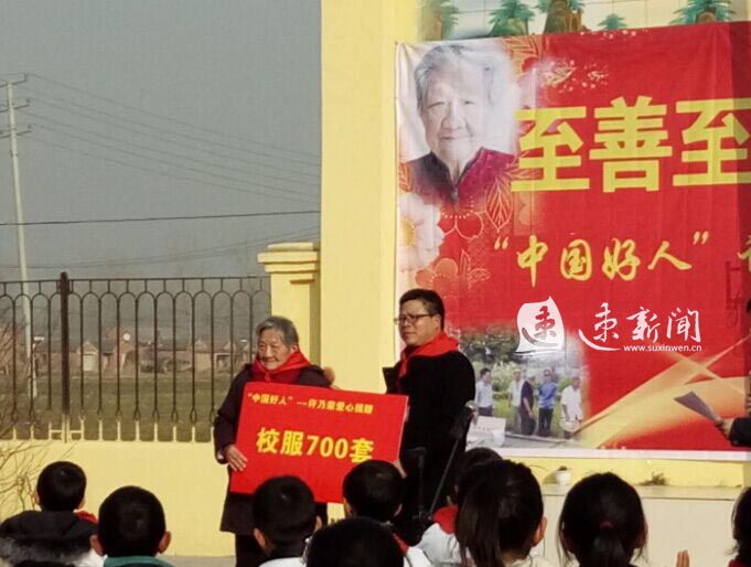 12月22日下午,“至善至美情暖校园”中国好人许乃荣爱心校服捐赠仪式,在泗洪县孙园镇淮北中学附属小学举行,该校700余名同学身穿崭新的校服,佩戴红领巾聚集在操场上,感谢许乃荣奶奶在寒冷的冬天为他们添置了校服。当90多岁的许乃荣奶奶在亲人的搀扶下步履蹒跚地来到同学们身边时,全场顿时响起热烈的掌声,这掌声是同学们对许奶奶最真诚的感谢。