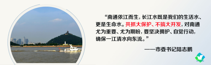 地处长江下游,但环保水平要力争上游。我市高度重视长江南通段的整治、利用和保护工作,严守生态环境底线和生态保护红线,严格保护和合理利用岸线资源,全力打造沿江“清水走廊”。