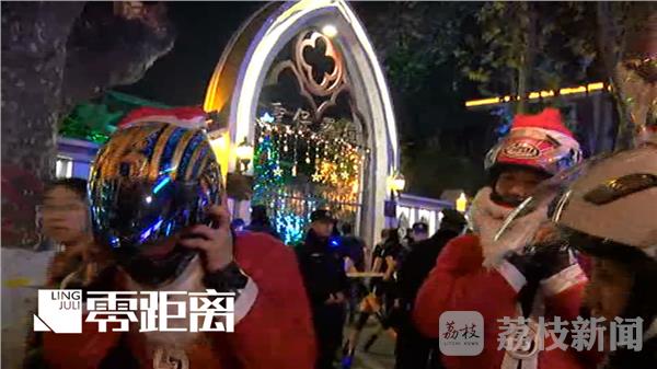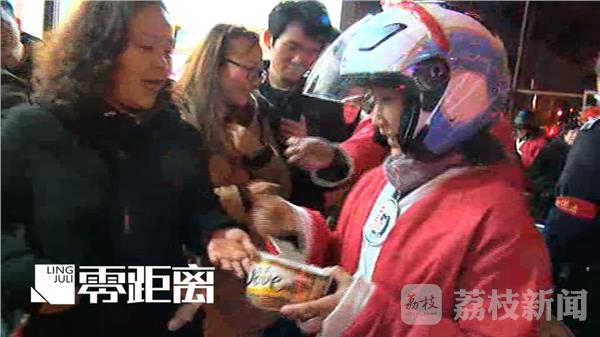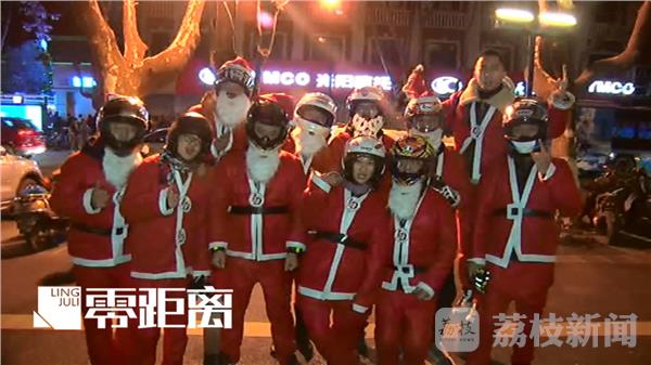 12月24日平安夜晚8点30分,南京一群摩托车骑友,装扮成圣诞老人,带着糖果、巧克力等零食前往圣保罗教堂门口,给寒风中排队等候进入教堂的市民发放。