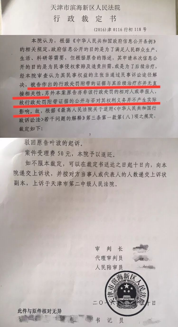 但一审法院回避了双方矛盾焦点——公开内容是否属于商业秘密并驳回了起诉,最终裁定,滨海新区市场监管局的行政行为对患者合法权益明显不产生实际影响,驳回原告叶波的起诉。