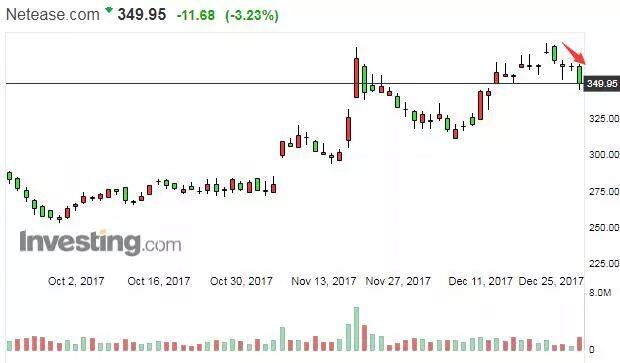 凤凰国际iMarkets讯北京时间周五(12月29日),网易ADR周四早盘在纳斯达克一度下跌逾4%,创下一个多月来最大跌幅。收盘跌3.23%报349.95美元,网易今年涨幅收窄至62.5%。