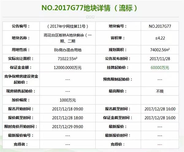 这几块地涉及板桥、青龙山地铁小镇还有汤山区域。率先拿出来竞拍的G77 地块为雨花台区板桥 A 地块剩余(一期、二期),用地性质属于商办混合用地。挂牌价为6亿元,没有最高限价。在本场土拍中,没有开发商报名参与竞价,最终流拍。