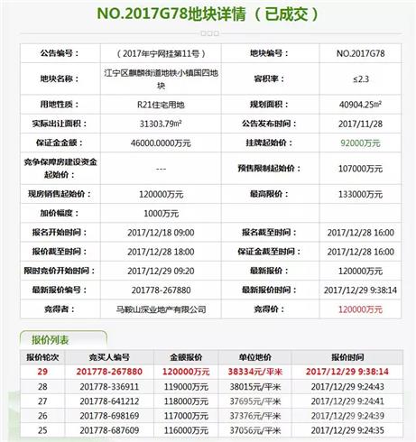 这次挂出的地块中,2幅江宁区麒麟街道地铁小镇的宅地,备受关注。其中,G78的B地块块内须配建一处15班幼儿园,由地铁小镇开发建设集团有限公司负责出资并建设,建成后无偿移交区政府,对应土地按划拨方式供应。经过29轮报价,该地块被马鞍山深业地产有限公司以12亿摘得,溢价30.43%,楼面地价16667元/平方米,未到达最高限价,需现房销售。