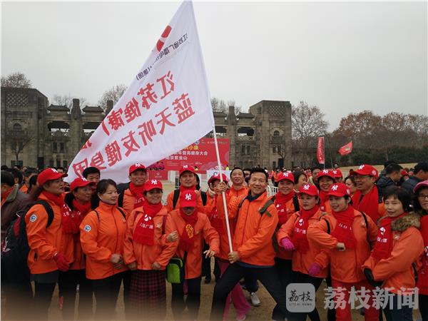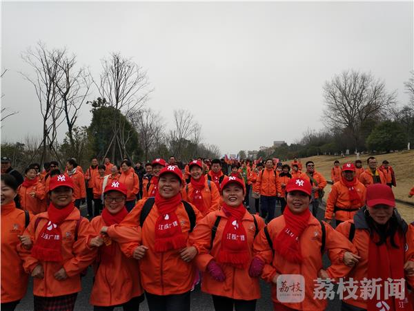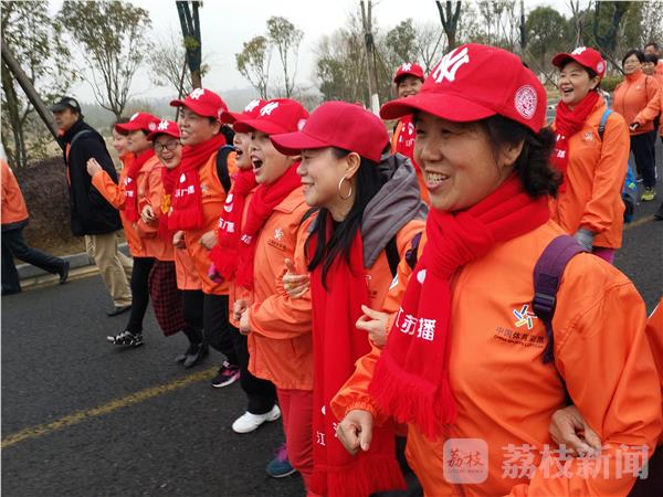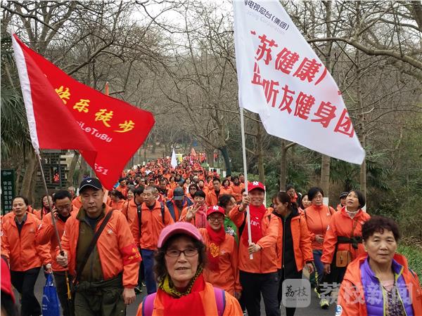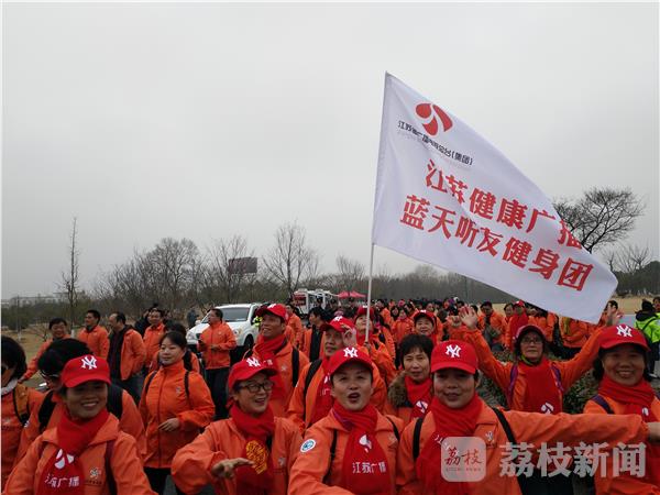 在当天活动中,一支由江苏健康广播主持人蓝天带领的“蓝天听友健身团”成为亮点。在登山的一路中,这些蓝天的粉丝们徒步一路边走边唱,边喊口号,相当拉风!欢声笑语此起彼伏,吸引了路人的目光。