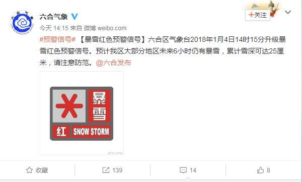 六合区气象台2018年1月4日14时15分升级暴雪红色预警信号。预计我区大部分地区未来6小时仍有暴雪,累计雪深可达25厘米,请注意防范。