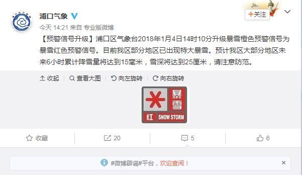 浦口区气象台2018年1月4日14时10分升级暴雪橙色预警信号为暴雪红色预警信号。目前我区部分地区已出现特大暴雪。预计我区大部分地区未来6小时累计降雪量将达到15毫米,雪深将达到25厘米,请注意防范。
