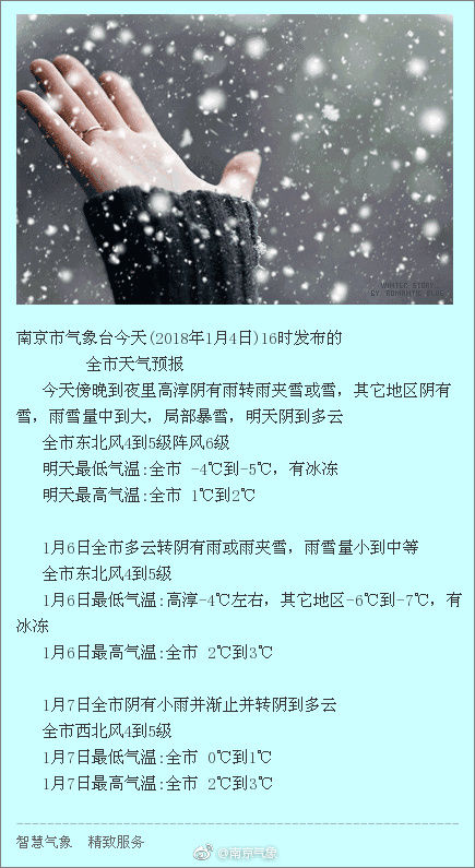 南京市气象台今天(2018年1月4日)16时发布的全市天气预报。