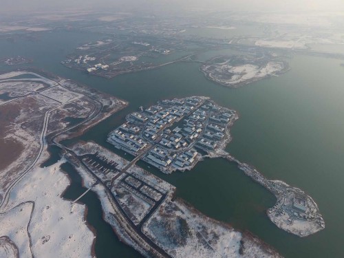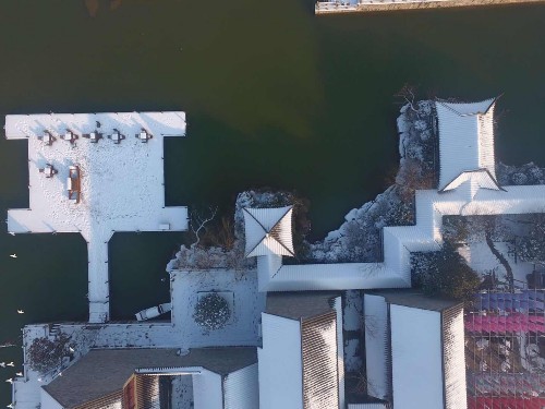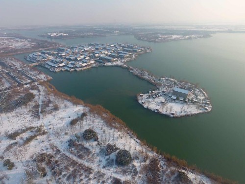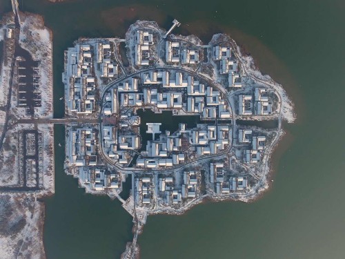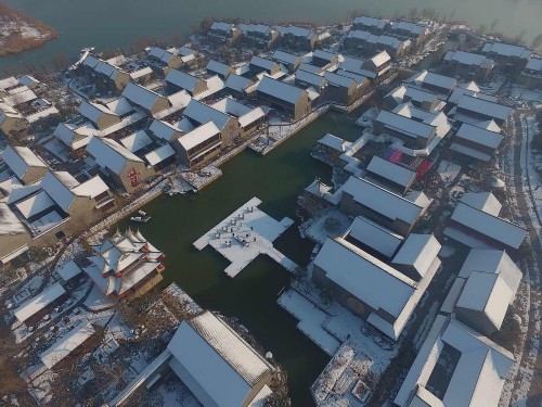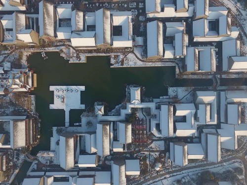 从空中俯瞰,雪后的潘安水镇宁静淡然,美不胜收。(图/孙井贤 编辑/吕诗)