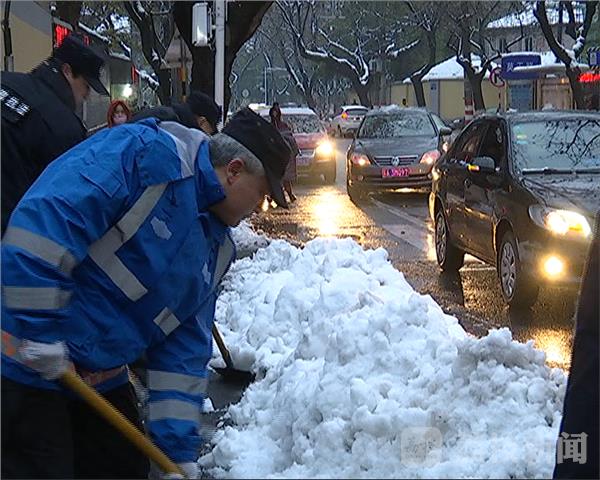 由城管、民警、环卫工等组成的扫雪队伍正在清理学校门口的积雪,保障学生和车辆通行。宁海中学校园内,教职工连夜为学生清理出一条方便通行的道路,在楼梯转角等雪水容易堆积的地方,还细心地铺上了草垫。