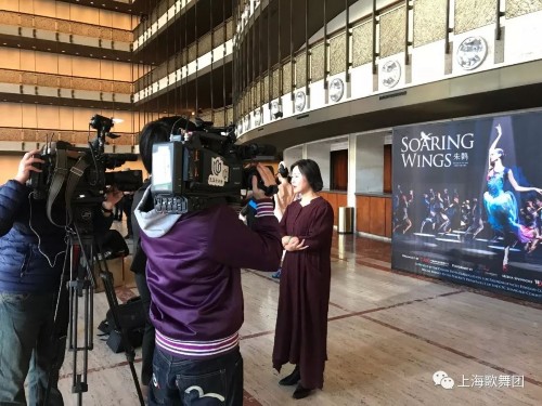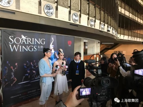 在演出当日下午的媒体记者采访会上,20多家中外媒体云集,上海歌舞团团长陈飞华、舞剧《朱鹮》导演佟睿睿、舞剧《朱鹮》主演朱洁静和王佳俊接受了媒体访问。