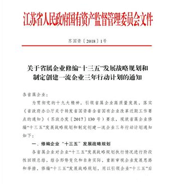 江苏省国资委近日印发《关于省属企业修编“十三五”发展战略规划和制定创建一流企业三年行动计划的通知》。 明确2018-2020年,各省属企业要将企业主业控制在3个以内,有条件的控制在1至2个;要确保在2018年底前,将本集团管理层级压缩至三级以内;要确保在2018年底前,计划内“僵尸企业”全部处置出清;在2020年底前,本集团停业、资不抵债等“四类企业”和连续三年无收益等“三类参股投资”的数量在2017年底基础上要减少80%以上。并进一步完善企业信息化建设专项规划。