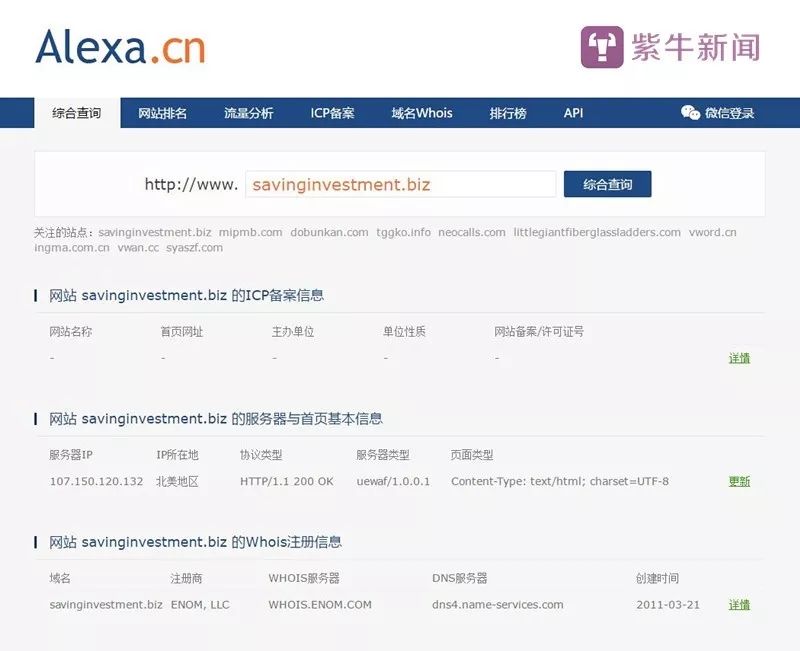 记者在权威的流量及IP地址查询网站Alexa对这两个网址进行了查询。两者的共同点是都没有我国的ICP备案信息,且IP地址和服务器全部在国外,前者注册商为ENOM,INC,地址所在地显示为亚太地区,后者注册商为ENOM,LLC,地址所在地为北美地区,注册者是个外国人。