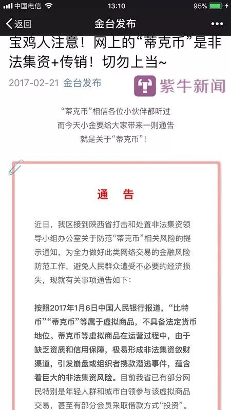 蒂克币到底是否涉嫌传销等经济犯罪?在蒂克币受害者群友指引下,记者在陕西省宝鸡市金台区人民政府办公室的微信公号“金台发布”上看到,该办公室曾在2017年2月21日发布过“金台区处理非法集资问题协调领导小组办公室”的通告,称陕西省有不少年轻人群参与投资交易,甚至借钱投资,提醒广大市民注意蒂克币等虚拟货币蕴含的巨大非法集资风险,避免遭受不必要的经济损失。