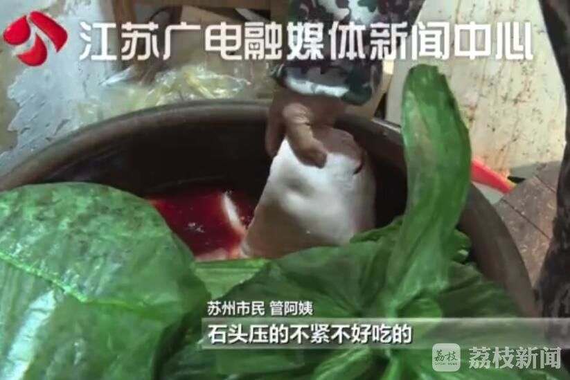 苏州市民管阿姨:“石头压的不紧不好吃的,我缸里面有三千块钱的肉。”