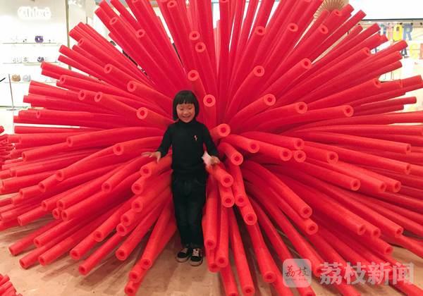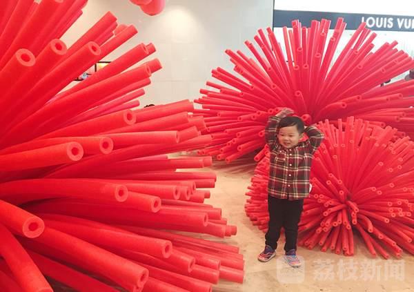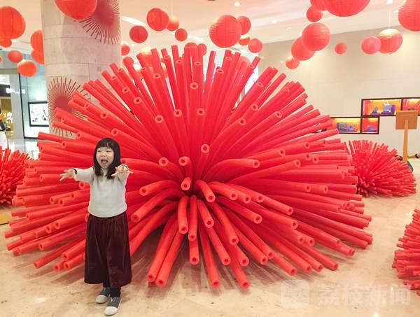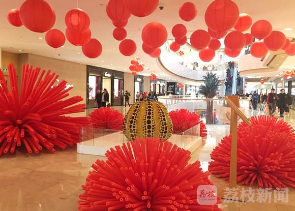 在南京新街口某商城堂内拍摄的以“中国红”与“中式圆”搭建出的主题场景吸引了不少市民的合照留影。
