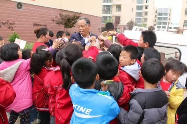 2017年4月24日,丰县图书馆主任孙厚营给农村贫困儿童送书,受到孩子们欢迎。
