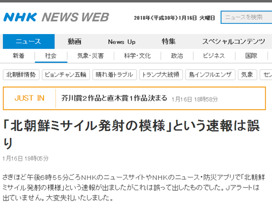 日本NHK电视台当地时间16日下午6时55分报道称,“朝鲜发射导弹,政府提醒居民到建筑物内或地下避难”。随后,当地时间7时,NHK称朝鲜发射导弹的消息是误报,对公众表示诚恳歉意。