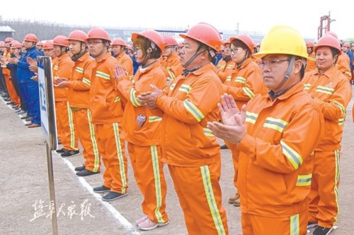 △施工单位代表参加开工动员会。 盐阜大众报报业集团全媒体记者 王亚洲 摄
