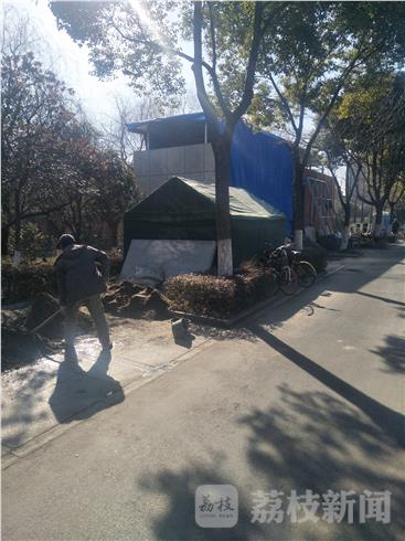 记者发现,这处路灯杆正位于一处施工工地旁边。施工人员表示,他们正在修建一处公厕,工人就居住在公厕旁边的工棚内部。在施工的过程中他们都是用发电机发电,只有到了晚上才会从路灯杆接电。