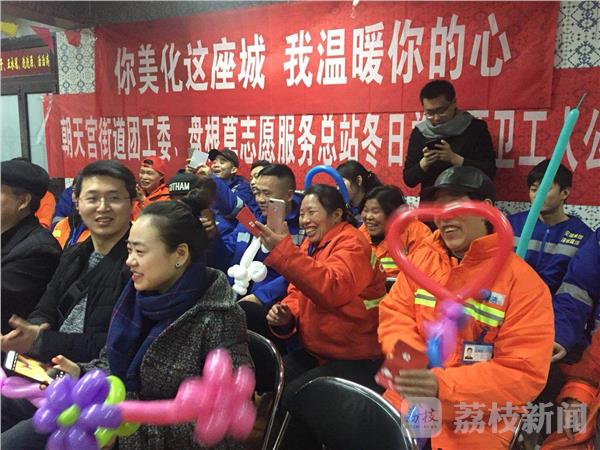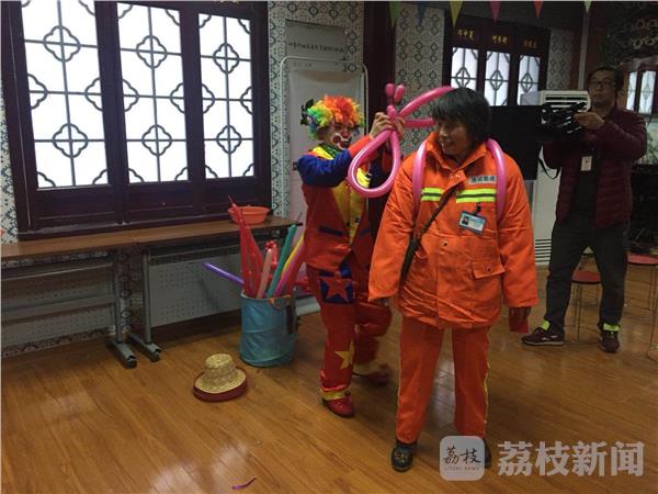 下午的互动活动主要分为文艺演出和趣味游戏两部分。精彩的双人舞和极具地方特色的南京白局表演赢得热烈掌声,魔术表演、杂技表演点燃了现场的活动气氛,加上趣味游戏、幸运抽奖,更将气氛推向了高潮。在活动中,环卫工人们还写下了自己的新年愿望。互动联欢结束后,所有环卫工人都前往煲盛宫火锅店,享用一顿火热的公益套餐。