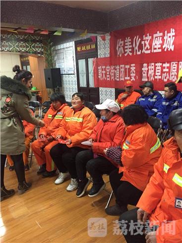 2018年1月18日下午四点,“你美化这座城 我温暖你的心—朝天宫街道团工委冬日关爱环卫工人公益活动”在朝天宫街道文体站温情开展。此次活动由朝天宫团工委主办,七家湾社区团支部和俞家巷社区团支部承办,辖区企业煲盛宫火锅店友情协办,志愿者和社区工作人员共同参与进行。